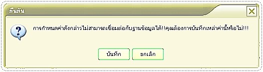 จากนั้นให้ทำการกดปุ่ม “ตกลง” และทำการบันทึกการเชื่อมต่อ เป็นอันเสร็จสิ้นการเชื่อมต่อระบบ ในกรณีที่เครื่องลูกข่าย ไม่สามารถเชื่อมต่อกับเครื่องแม่ข่ายได้ ซอฟต์แวร์จะแจ้ง ดังรูป ต้องทำการเช็ค IP Number ของเครื่องแม่ข่ายอีกครั้ง และระบบสาย LAN ที่ใช้เชื่อมต่อด้วย