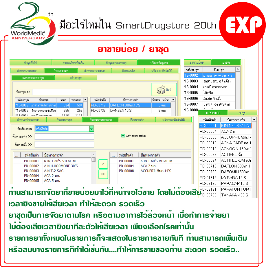 SmartDrugstore 20th เป็นซอฟต์แวร์ที่ถูกออกแบบสำหรับใช้งานทั่วไป ใช้งานง่าย การวางหน้าจอเป็นระบบและมีระเบียบในการใช้งาน มีการแสดงข้อมูลการขายอย่างครบถ้วน แบบการขายแสดงให้เห็นในหน้าเดียว มีการเพิ่มประสิทธิภาพด้านต่างๆ เช่น การชำระเงินผ่านรูปธนบัตร ระบบบัตรเครดิต, บัตรสมาร์ทเพริ์ส, การเข้าทำงานเป็นผลัดของพนักงาน, การเชื่อมต่อกับอุปกรณ์ต่างๆ เช่น เครื่องพิมพ์ฉลากยา เครื่องพิมพ์สลิปใบเสร็จ เครื่องอ่านบาร์โค้ด, การลงรหัสการขายของพนักงานแต่ละคนเพื่อคำนวณยอดขาย, ระบบการเช็คการเปิดปิดลิ้นชักอัตโนมัติ, ปรับปรุงเรื่องคลังสินค้า, เพิ่มเติมระบบรายงาน, พัฒนาและปรับปรุงระบบรหัสยา และ การสั่งซื้อ, เพิ่มความรวดเร็วและง่ายในการใช้งานมากขึ้น