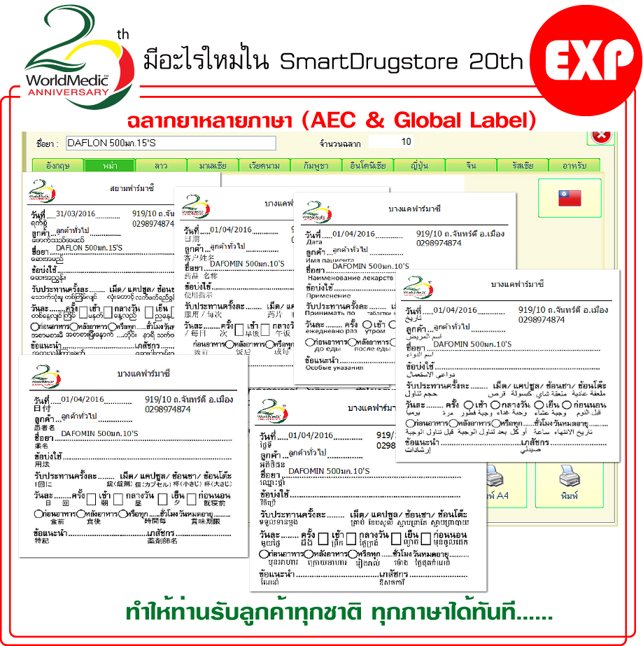 ระบบการพิมพ์ฉลากยาหลายภาษา (Global Label) ระบบการพิมพ์ฉลากยาที่ทำให้ผู้ขายไม่มีภาระเรื่องภาษาอีกต่อไป เนื่องจากฉลากยาที่พิมพ์จะมีภาษาไทยกำกับอยู่กับแต่ละภาษา ทำให้เกิดความมั่นใจและปลอดภัยต่อคนไข้ในการจ่ายยา ให้กับลูกค้าชาติต่างๆ มีทั้งหมด 12 ภาษา (รวมภาษาไทย)