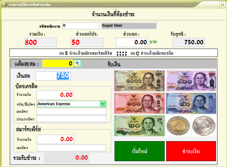 ระบบการขายแบบเลือกธนบัตร ระบบการขายแบบเลือกคีย์ยอดเงินจากรูปธนบัตร ทำให้สะดวก รวดเร็ว ใช้งานร่วมกับจอทัชสกรีนได้เป็นอย่างดี
