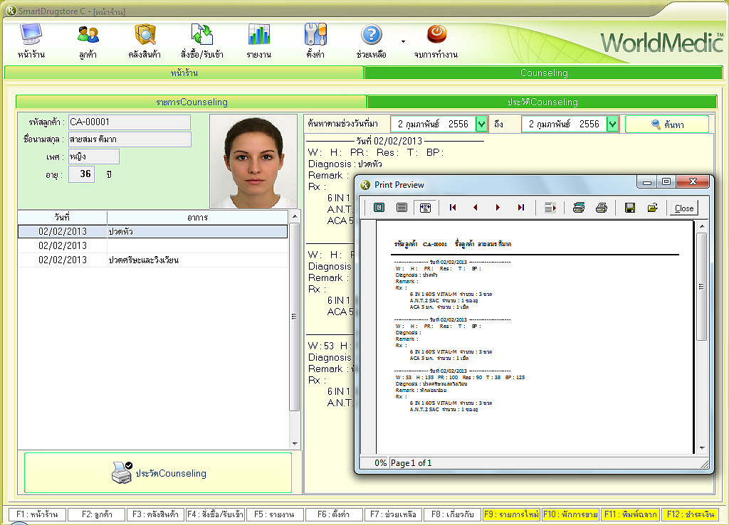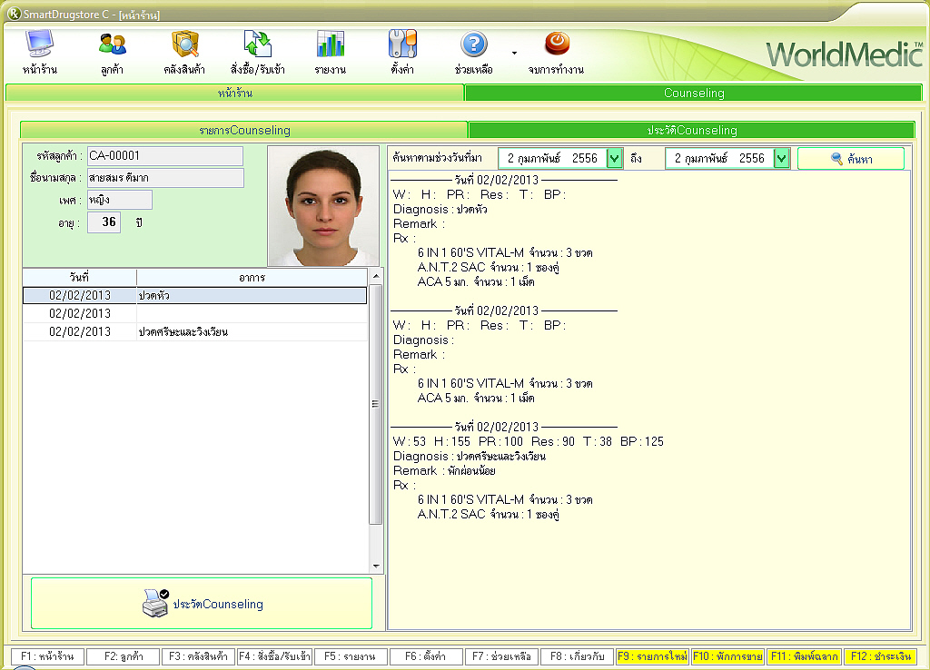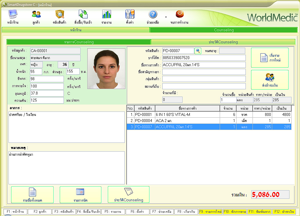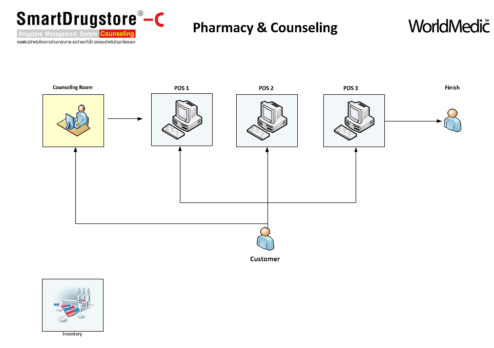 | SmartDrugstore-C นวัตกรรมใหม่สำหรับซอฟต์แวร์ร้านยาที่ถูกพัฒนาขึ้นมาเพื่อรองรับระบบการให้คำปรึกษาโดยเภสัชกร โดยมีระบบห้องปรึกษา วินิจฉัย จ่ายยา และเก็บประวัติ อย่างเป็นระบบ (Counseling Room) ทั้งนี้จะเหมาะสำหรับร้านยาที่มีเภสัชกรให้คำปรึกษาคนไข้ที่มีห้องปรึกษาหรือโต๊ะให้คำปรึกษาแยกกันกับระบบการขายยาหน้าร้าน ระบบนี้จะเชื่อมต่อกับระบบคลังสินค้าและยา เมื่อเภสัชกรได้ให้คำปรึกษาคนไข้แล้ว สามารถบันทึกประวัติคนไข้ และจ่ายยาส่งออกมาด้านนอก ที่เคาท์เตอร์ โดยเคาท์เตอร์ด้านหน้าจะเห็นรายชื่อคนไข้แสดง สามารถเรียกชื่อคนไข้เพื่อมารับยาและจัดยา ชำระค่ายาได้ที่เคาท์เตอร์ |